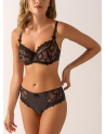 Le travail de découpe sur le devant de la culotte de Louise élance la silhouette et séduit par son grand confort.Le double tulle « en fourreau » sur le panneau central amène maintien et douceur et la guipure posée aux cuisses allège et décore cette pièce.