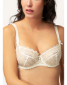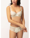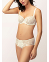 Une belle mise en scène de la broderie du soutien-gorge corbeille avec armatures Romy, apprécié pour son décolleté et son parfait maintien. Le bonnet en trois parties dessine un joli galbe, accentué par les rondeurs régulières du bord festonné. Au creux de la poitrine, un soupçon de dentelle et un délicat ruban décoré d’un anneau attirent l’attention de cette forme incontournable. Dans son coloris Naturel, Romy est un thème doux et romantique qui magnifie toutes les silhouettes.