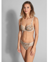 Le string demeure l’ultime pièce de la séduction. Sur le devant, les fleurs brodées scintillent et s’associent idéalement au motif géométrique, élançant ainsi les courbes. Les petits nœuds satin posés ici et là sont la touche fantaisie de cette forme très sexy. Le motif est sublimé avec la délicat palette aux tons naturels du coloris beige Or ancien.