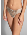 Der String ist und bleibt das ultimative Accessoire der Verführung. Auf der Vorderseite funkeln gestickte Blumen, die ideal mit dem geometrischen Muster harmonieren und die Kurven optimal zur Geltung bringen. Die kleinen Satinschleifen, die hier und da angebracht sind, verleihen diesem sexy Modell zusätzlich einen verspielten Touch. Die delikaten Naturtöne des Beigetons „antikes Gold“ bringen das Motiv perfekt zur Geltung.