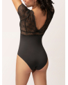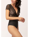 De body Romy met zijn diepe decolleté, zijn combinatie van zacht tricot en verleidelijk borduurwerk en zijn sombere, sensuele kleur Reglisse vormt het hoogtepunt van deze collectie. De korte mouwtjes vallen elegant op de schouders, voor een ultra romantische look.