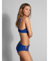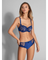 De uitsnijdingen aan de voorkant verlengen het silhouet en verleiden door het bijzonder comfort van dit model. De nauwsluitende dubbele tule op het voorpand zorgt voor ondersteuning en zachtheid en de guipurekant op de dijen verlicht en versiert dit broekje. Microvezel tricot aan de achterkant zorgt voor ondoorzichtigheid en comfort. Wij zijn dol op deze koningsblauwe kleur, sterk en warm tegelijk.