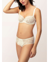 Het comfortabele, zachte en elegante broekje Romy charmeert met zijn uitsnijdingen van kant en borduurwerk. De hoge taille verlengt het silhouet visueel met veel allure en de kleur naturel sublimeert elke huidskleur subtiel.