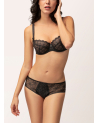 Het broekje Romy verleidt in zijn intense, diepe kleur Réglisse. De hoge taille en de voering aan de voorkant stellen gerust en benadrukken het fijne grafische borduurwerk van het thema.