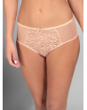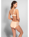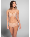 Ongelooflijk licht en verfijnd chic. De combinatie van materialen geeft structuur en verlengt het silhouet visueel. De achterkant is van soepel, ondoorzichtig materiaal dat heel zacht aanvoelt. Het elastiek in de taille is bewerkt op dezelfde manier als een taille uit de haute couture en hetzelfde detail komt terug in de beha. Een lingerie met goudkleurige beigetinten en een tijdloze amandelkleur om uzelf een plezier te doen.