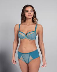 Een geruststellend, eigentijds model dankzij de verhoudingen en het spel van geborduurde uitsnijdingen. De taille is benadrukt met fijn netwerk dat dit zeer visuele broekje extra elegantie en lichtheid geeft. In de grandioze kleur Aquamarijn is het blauw gecombineerd met gouden details is dit thema een absolute topper in uw garderobe.