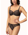 De omhullende beugelbeha Romy is de nieuwe must-have van de garderobe. De kleur Réglisse verrast door zijn intensiteit en zijn diepte, en belicht het grafische bloemenborduurwerk van het thema prachtig. De bandjes in het midden zorgen voor optimale ondersteuning en rondingen terwijl de voering in de onderkant van de cups geruststelt. Een en al welzijn.